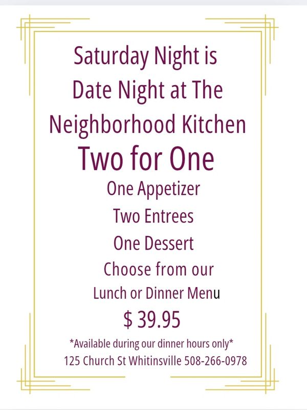 ENJOY TWO-FOR-ONE DATE NIGHT EVERY SATURDAY AT THE NEIGHBORHOOD KITCHEN IN WHITINSVILLE! TWO ENTREES, ONE APP AND ONE DESSERT=A PERFECT NIGHT OUT!